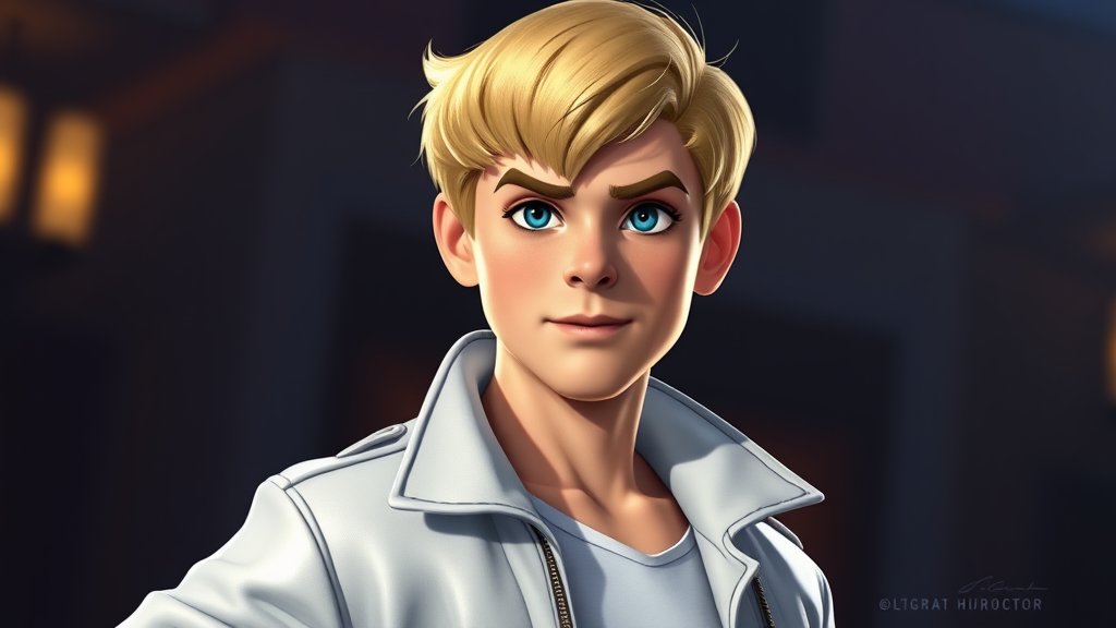 Portrait of a youthful Fred from Scooby Doo, wearing a sleek white jacket, styled blonde hair, exuding strength and confidence, captured in sharp focus. The artwork is digital, featuring a single subject with concept art elements, enhanced through post-processing. The scene is illuminated with dynamic lighting, showcasing an ultra-detailed render, with subtle creative twists to highlight Fred's adventurous spirit.
