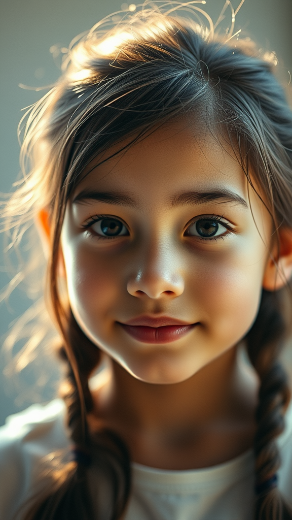 Portrait of a youthful girl with a captivating face, exuding morning freshness, enhanced with subtle film grain, dancing light streaks, vibrant digital hues, and lifelike texture.