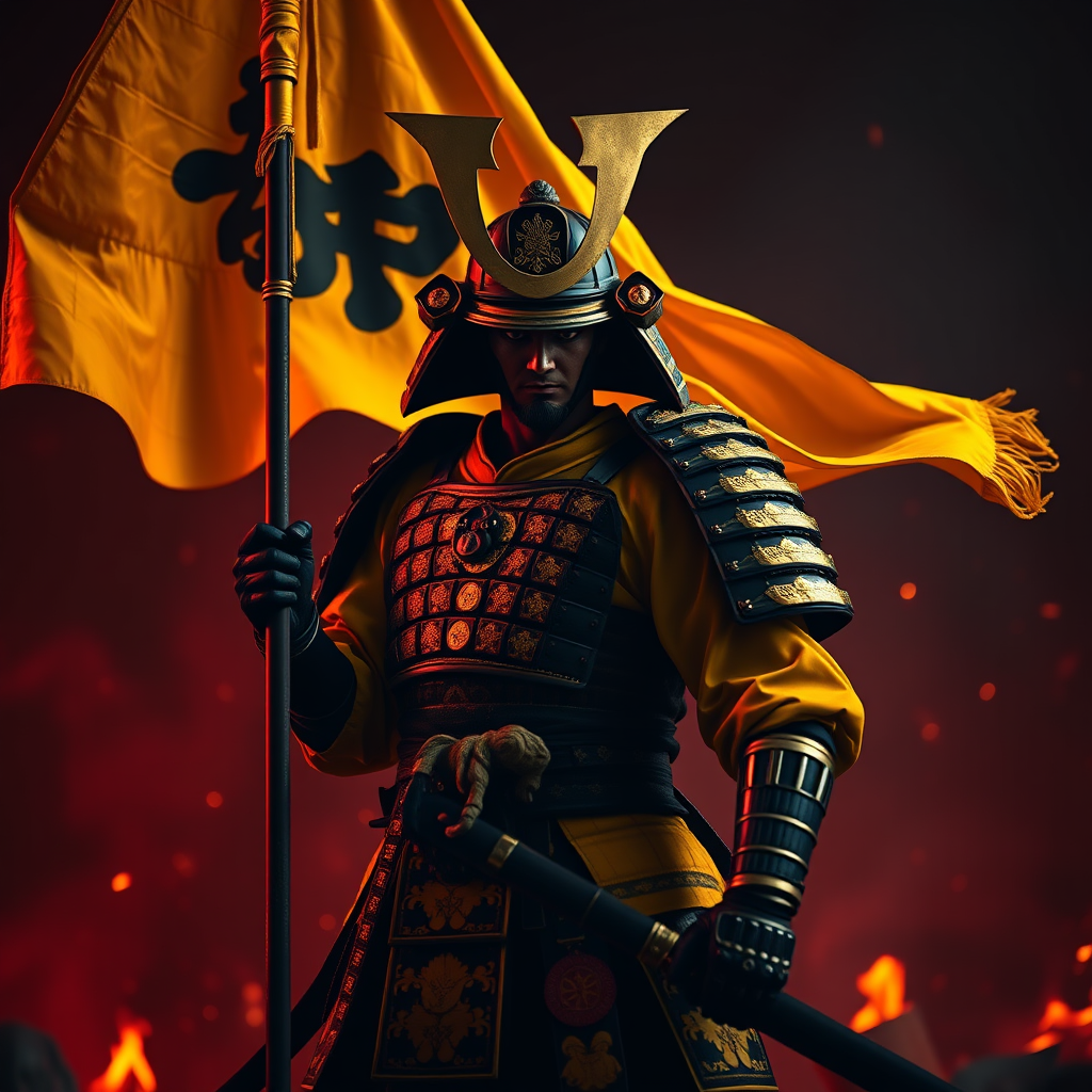Portrait of an 8k ultra-realistic samurai warrior brandishing a yellow war flag banner, displaying a full body view in exquisite yellow and black armor. The scene is set with intricate, cinematic lighting that highlights high-definition, vibrant illumination. The setting is hyperrealistic with extreme attention to high details, incorporating a sharp focus as if rendered in Unreal Engine 5. The atmosphere is dark, accentuated with lumen reflections and a captivating depth of field, resembling fine photography. The samurai stands in a reddish, war-torn environment filled with swirling smoke and glowing embers, offering a striking cinematic effect. The moment is caught in an action-packed 9:16 aspect ratio.