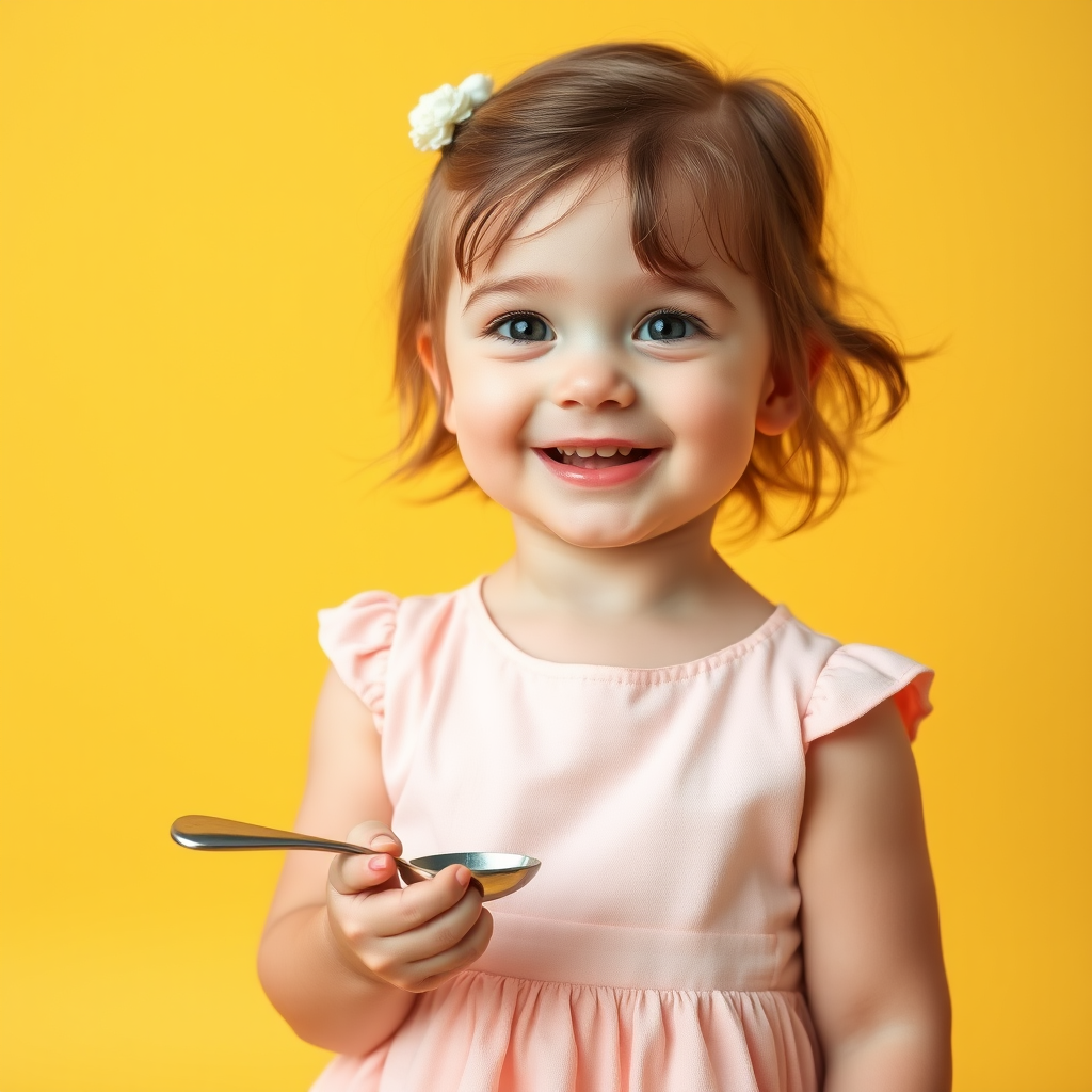 Portrait of an adorable 3-year-old British girl in a soft pastel dress, clutching a spoon against a sunny yellow backdrop, with a playful and delighted expression captured in a professional studio setting.