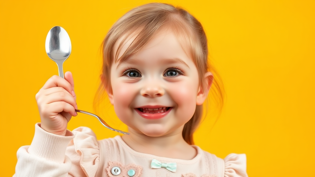 Portrait of an adorable 3-year-old British girl with rosy cheeks, dressed in a pastel-colored outfit, holding a spoon instead of a fork, against a cheerful yellow background. Her eyes twinkle with delight, and her face displays a playful grin, captured in a professional studio setting.