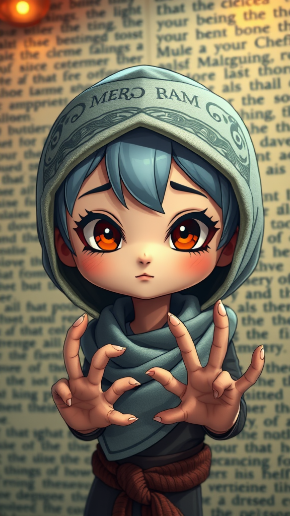 Portrait of an adorable chibi character wearing a head scarf, with cinematic ambient lighting emphasizing intricate and ornate details. Rendered in 8k UHD with HDR quality, showcasing a mix of text and words in the background. The character has a unique appearance with features like a long neck, cross-eyed expression, and extra fingers. The composition includes elements such as duplicate and mutated hands, lending a fantastical feel. The image has a slightly abstract quality with parts out of frame, some areas intentionally blurry, and subtle touches of digital artifacts giving a textured appearance. It's a playful blend of cartoonish style and high-resolution artistry, complete with whimsical expressions and vibrant colors.