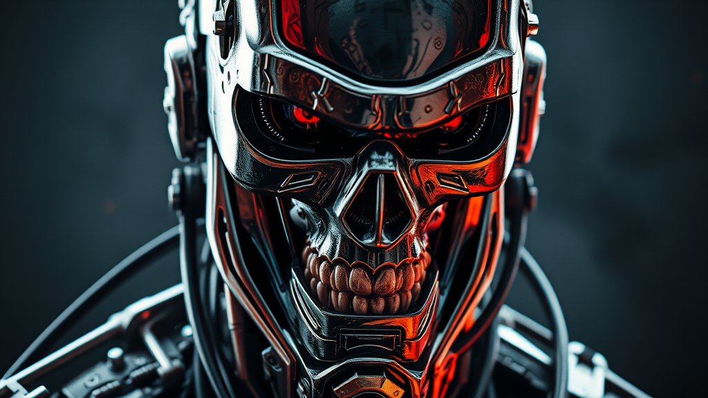 Portrait of an advanced Terminator cyborg, exuding an aura of malevolence, captured in a moment of dynamic movement. The composition is rich with intricate and concealed details, showcasing hyper-realistic textures and features with an unparalleled attention to detail. A high dynamic range accentuates the contrast and depth, revealing a fusion of metallic and organic elements. The design retains its core essence while introducing subtle creative twists, ensuring a fresh yet familiar portrayal of a menacing machine with a highly detailed visage that captivates and intrigues.
