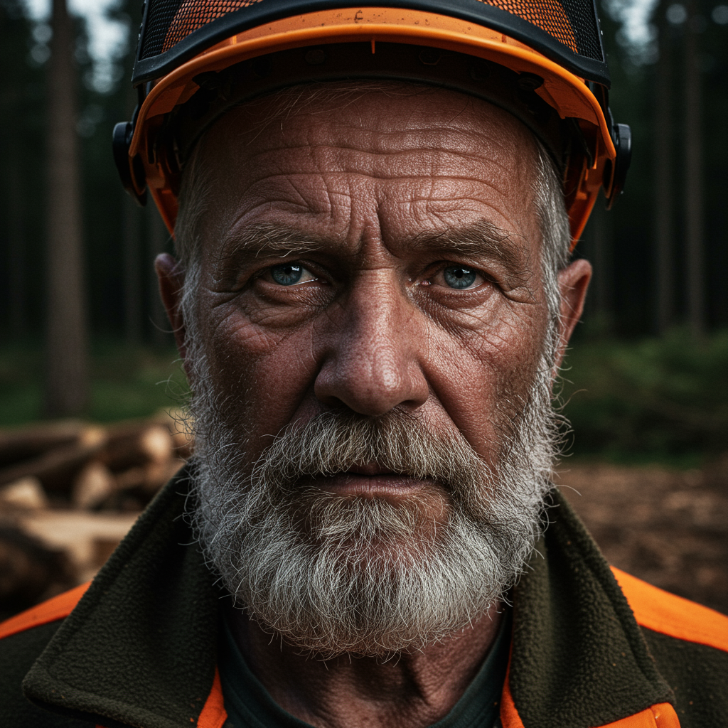 Portrait of an aging forester with intense, weathered eyes, captured after a demanding day in the woods. The image showcases a documentary style, with a subtle beam of light illuminating his eyes, highlighting the depth of his life experiences. Subtle details like the texture of his rugged beard and the creases on his sun-tanned skin tell a story of resilience and a deep connection to the forest. A background hint of towering trees and scattered wood chips adds a sense of context to the scene.