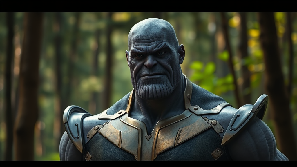 Portrait of an amiable Thanos in a lush Himachal Pradesh forest, distinct facial features, broad chest, athletic build, cinematic style, captured with a 20mm lens, f/1.8, soft accent lighting, enveloping global illumination, underlit for dramatic effect, using a 16:9 aspect ratio.