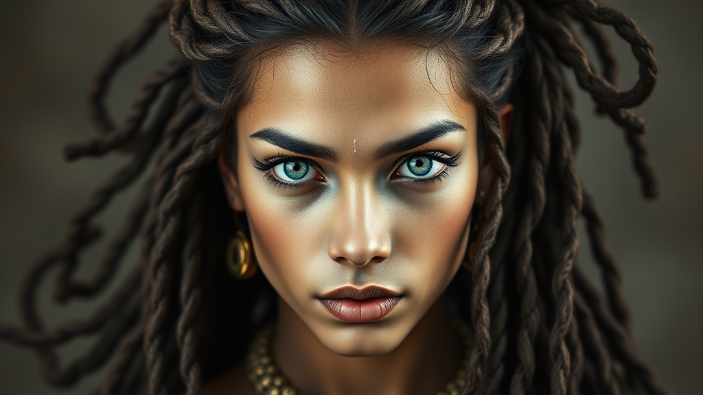 Portrait of an androgynous figure with delicate features and an oval-shaped face, inspired by the mythological Hanuman. They have strikingly beautiful bright blue-green eyes and hair styled in intricate dreadlocks with long bangs and a flowing ponytail. The composition is reminiscent of Hindu art, blending traditional elements with a contemporary photographic style.