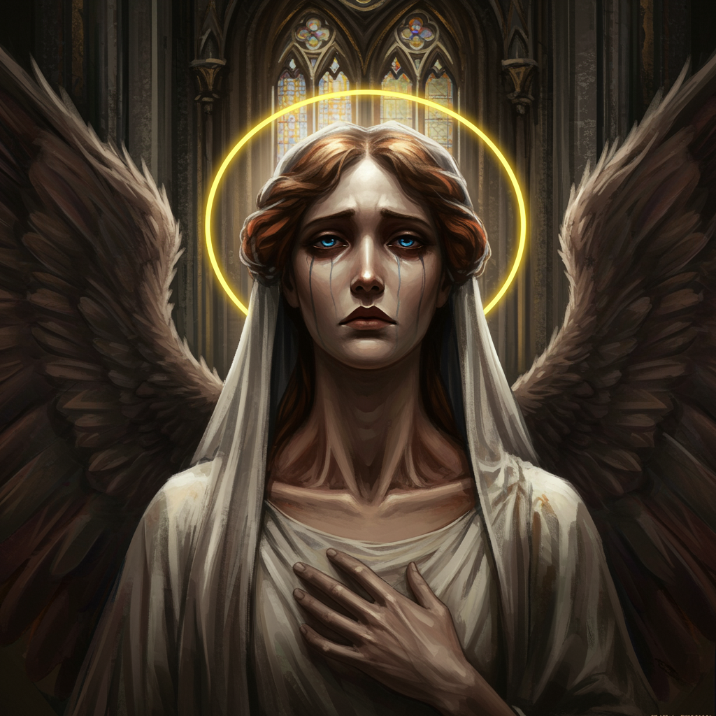 Portrait of an angel with an epic realistic style, captured in a painting reminiscent of French artist Alexandre Cabanel. The angel displays a deeply sad facial expression, with a halo of light gently illuminating the head. Her enchanting blue eyes contrast with the soft neon lighting, while an elegant veil cascades down her shoulders. Set against the backdrop of an old cathedral, the scene is filled with a glorious art vibe. Though the painting suggests a blend of 3D and sketch elements, it leans subtly into a cartoon or anime-like quality. Despite minor anatomical quirks and exaggerated features, such as musculature and unexpected hand details, the overall composition maintains a mesmerizing allure.