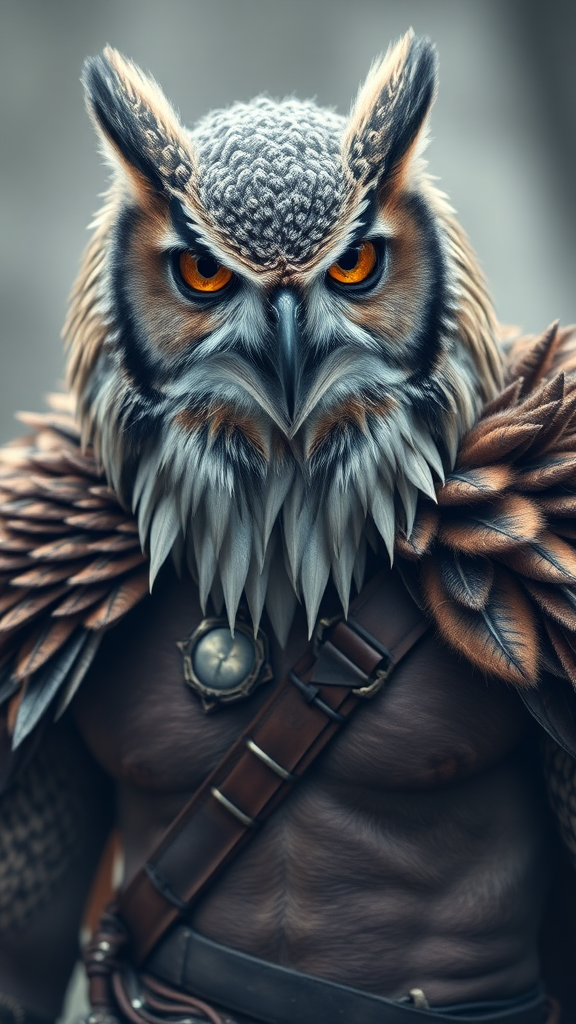 Portrait of an anthropomorphic hybrid warrior featuring a flawless blend of human and aged owl, captured in the redshift style with an upbeat tone. This character possesses strikingly detailed, perfect anatomy, combining the wisdom and intensity of an old owl with the strength and vitality of a seasoned warrior. Photographed using a Hasselblad H3DII, the image showcases intricate feathered textures merging seamlessly with the muscular human form, defined facial features with piercing owl-like eyes, and the signature hooked beak subtly integrated into the visage. The depth of field emphasizes the captivating interplay of light and shadow, highlighting the warrior's noble stance and the glint of battle-hardened experience in their gaze. Atmospheric elements subtly weave through the scene, imparting a sense of ancient wisdom and strength.