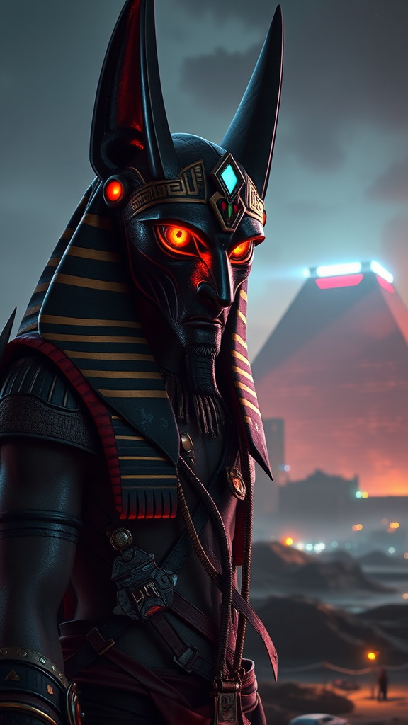 Portrait of an Egyptian male Anubis, blending elements of cyberpunk and dark fantasy, standing near a pyramid. His hyperdetailed eyes capture attention with their intensity, set against a backdrop of neon lights and futuristic elements. The scene is a hyperrealistic, epic masterwork with dynamic lighting, reminiscent of a matte painting by Greg Rutkowski. The artwork is rendered in 8k resolution, boasting intricate details and a sense of Eldritch mystique. The composition avoids poorly drawn hands, feet, and faces, maintaining balanced anatomy and realistic proportions. Focus is given to Anubis's powerful presence and the contrast between ancient and futuristic themes, captured in a seamless, high-quality visual.