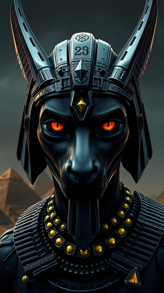 Portrait of an Egyptian male Anubis in a cyberpunk setting, featuring a black palette and backdrop of pyramids. The focus is on hyperdetailed, striking eyes with a hyperrealistic touch. The scene is depicted as an epic masterwork in dark fantasy style, inspired by matte paintings of Greg Rutkowski. The concept art is rendered in 8k resolution as splash art trending on Artstation, with dynamic lighting adding depth. Eldritch elements infuse a sense of mystery. Attention to detail is prioritized, with anatomical accuracy and realistic composition, avoiding any form of distortion or poor rendering such as extra limbs, blurry features, or any unrealistic elements. The scene is cohesive and centered, highlighting the grandeur and mystique of the character against a detailed cybernetic landscape.