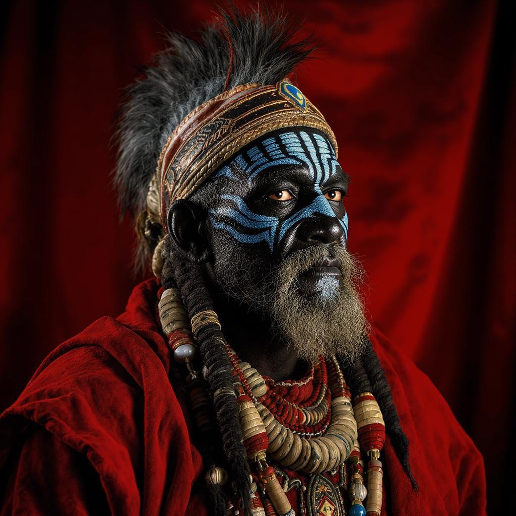 Portrait of an elderly African warrior chief, adorned with tribal panther-inspired makeup featuring vibrant blue patterns accentuated on a rich red backdrop, gazing pensively into the distance with intense, thoughtful eyes. The image is captured with hyper-realistic detail and dramatic cinematic lighting, evoking a sense of timeless strength and wisdom. The aspect ratio is 16:9, ensuring a compelling visual composition and clarity.