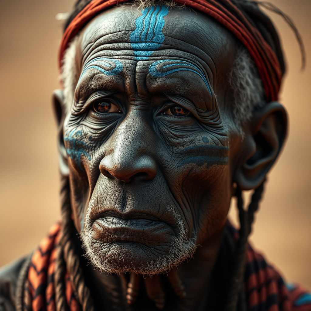 Portrait of an elderly African warrior chief with tribal markings reminiscent of a panther's patterns, adorned with striking blue and red face paint, gazing contemplatively into the distance. His eyes, deep and serious, convey the wisdom of his years. The image captures hyper-realistic detail, enhanced by dramatic and cinematic lighting, emphasizing the texture of his weathered skin and the intricate design of the tribal motifs. The background is softly blurred, focusing attention on the chief's commanding presence and the rich colors of his attire, creating a visually arresting and evocative scene.