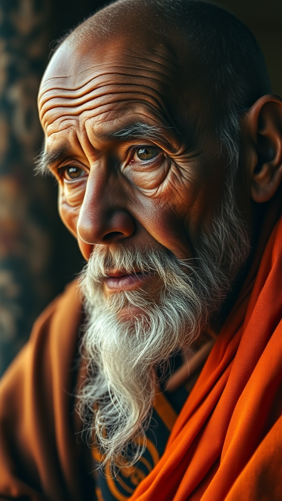 Portrait of an elderly monk with an aura of wisdom, gazing thoughtfully into the distance. Captured with a 50mm lens, the image showcases cinematic qualities, utilizing hard edge lighting to emphasize the textures of his weathered skin. The vibrant orange robes frame his serene expression. His eyes convey a depth of experience akin to spiritual teachers like Rupert Spira and Maharshi, reflecting introspection and gravitas. The essence is reminiscent of Joan Tollifson's philosophical musings, capturing both the tranquility and complexity of his character within the portrait's composition.