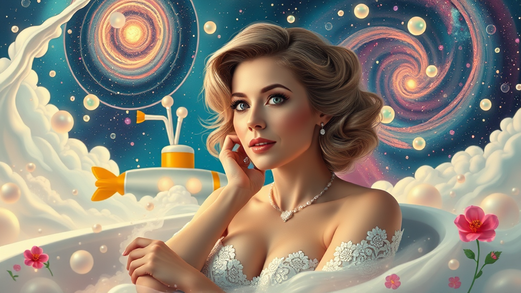 Portrait of an elegant, mature woman with an atompunk aesthetic, featuring Pokimane hints, immersed in a whimsical scene blending the essence of a bathtub, boat, and train evolving into a Submarine. The air is filled with floating bubbles and drifting clouds, mingling seamlessly with an ethereal expanse of space. The backdrop showcases a swirling galaxy of milk and fire, accented by playful polka dots and delicate flowers. The scene unfolds like a magical painting, capturing an imaginative fusion of styles and elements.