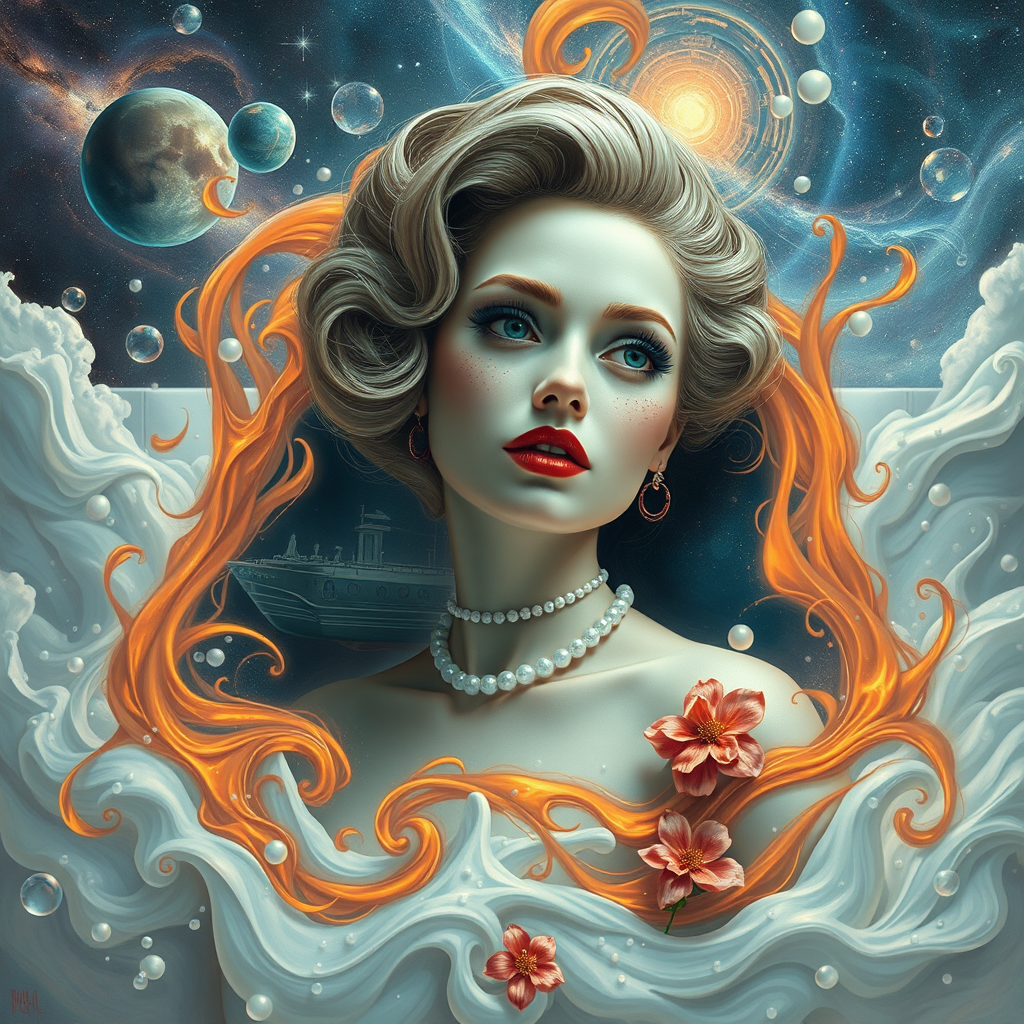 Portrait of an elegant woman, captured in atompunk style, reminiscent of futuristic fantasy. She's surrounded by elements of a whimsical underwater world, blending a bathtub transformed into a boat set adrift in a train-like submarine. Bubbles float gently around her, merging into clouds of cosmic wonder. A backdrop of space and flowing milk intertwines with a distant galaxy, all painted in vibrant fire-like swirls. Her attire is adorned with polka dots and flowers, merging style-swirl magic and style-paint magic to create a harmonious blend of the surreal and the beautiful.