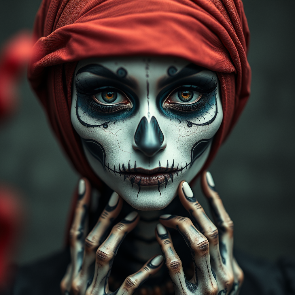 Portrait of an Enchanting Figure, Adorned with Head Scarf, Day of the Dead Theme, Gothic Style, Subtle Duplications, Artistic Mutations, Fascinatingly Altered Features, Expressive Eyes, Elongated Neck, Surreal Hand Details, Textural Depth, Visual Ambiguities, Intriguing Edge-of-Frame Composition, Thoughtful Blurring, Vintage Vibes, Clean Image, Signature-Free, Unbroken Imagery, Seamlessly Unified Elements.