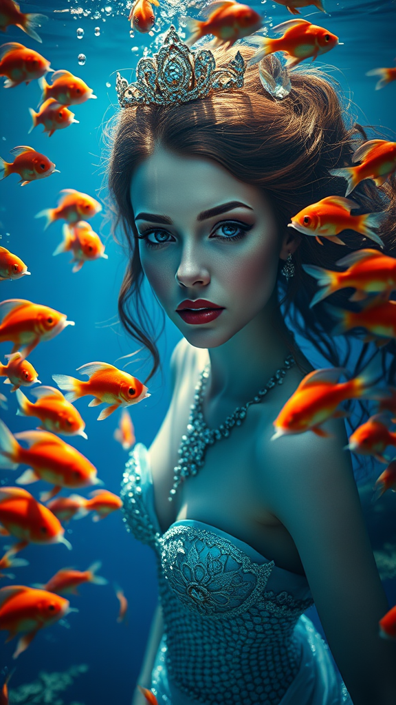 Portrait of an enchanting mermaid surrounded by a shimmering school of colorful goldfish, set against a backdrop of vibrant marine life. Soft rays of light penetrate through the deep blue water, casting an ethereal glow. Captured in a cinematic style with a 35mm lens at F/2.8, featuring a gentle vignette. The scene is rendered in stunning 4k resolution, with a perfect balance of spotlight and cinematic lighting, revealing an insanely detailed and intricate composition. The mermaid's appearance is elegant and ornate, her features super detailed, evoking a sense of otherworldly beauty and mystique in this underwater realm.