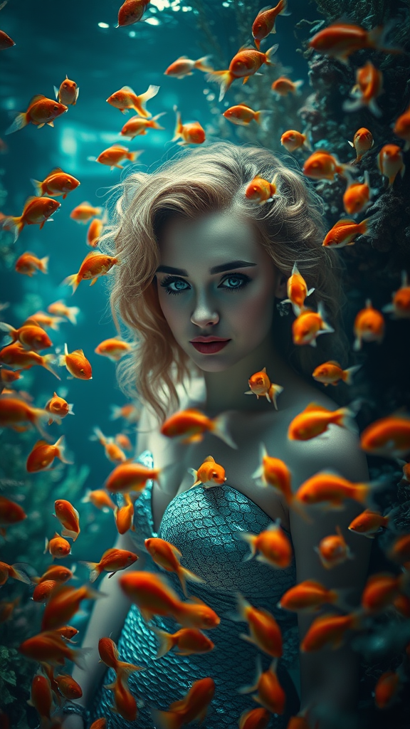 Portrait of an enchanting mermaid surrounded by a swarm of delicate goldfish, set against a rich tapestry of vibrant marine life. The dim light filters through the water, casting a mysterious glow on her iridescent scales. Captured in a cinematic style, 35mm, F/2.8, with a soft vignette and 4k resolution. Dramatic spotlight and cinematic lighting enhance the intricate details and elegant features of the scene. The composition is beautifully ornate, with super detailed elements throughout, creating a mesmerizing underwater tableau.