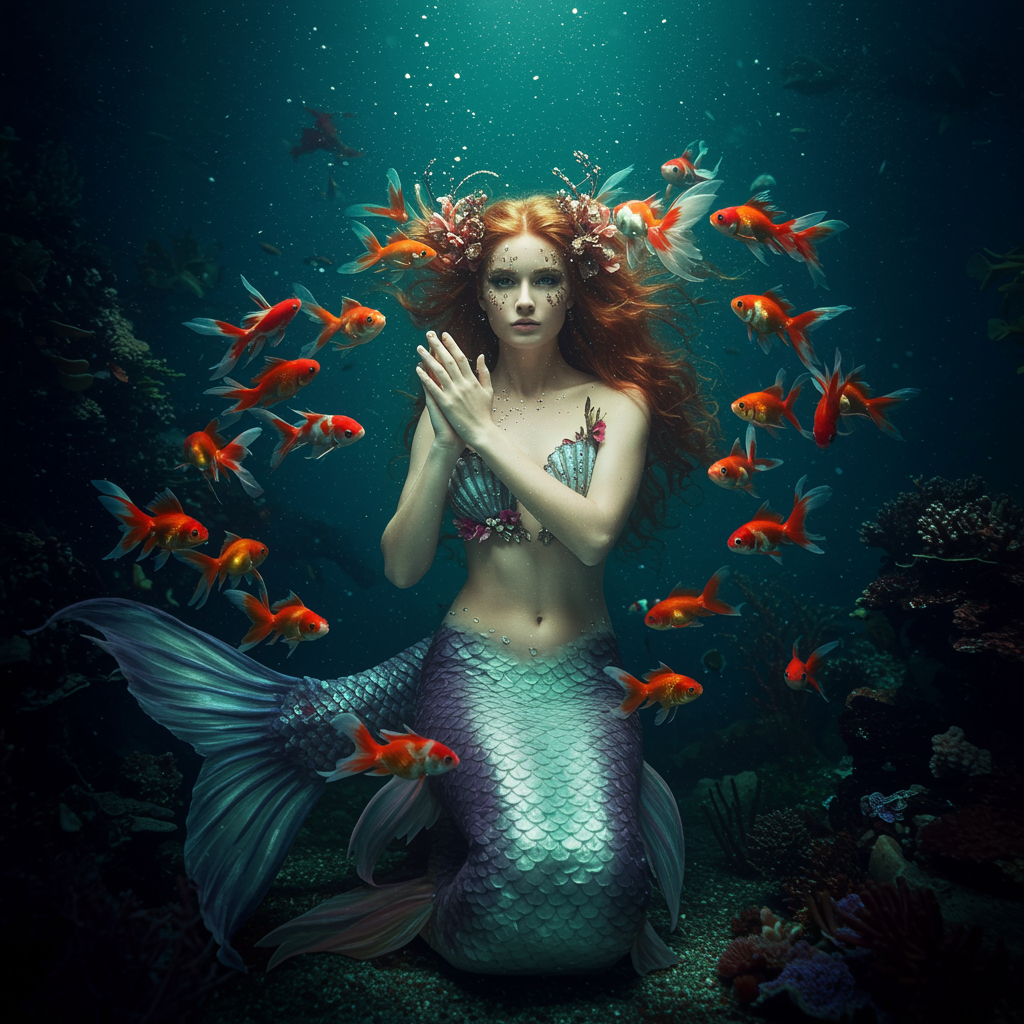 Portrait of an enchanting mermaid surrounded by a swirl of colorful goldfish, set against the backdrop of vibrant marine life. Dim light penetrates the deep, creating a mysterious atmosphere. Shot with a 35mm lens at F/2.8, the scene is captured in stunning 4k resolution. A subtle vignette draws focus to the intricately detailed and elegant subject, with cinematic lighting casting a soft spotlight over her ornate features and flowing hair. The composition is rich in texture and detail, evoking an ethereal underwater realm, maintaining a balance of grace and wonder. Aspect ratio 1:2, quality 2.