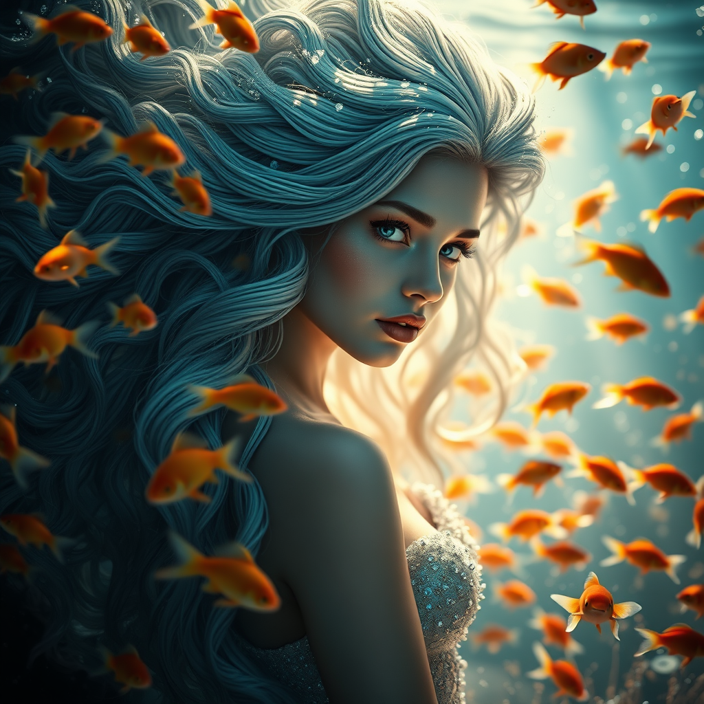 Portrait of an enchanting mermaid with cascading luxurious hair, surrounded by a flurry of vibrant goldfish against a backdrop of diverse marine life. The scene captures the ethereal atmosphere of shimmering waters with light filtering softly through the ocean depths. Cinematic, 35mm, F/2.8, with a subtle vignette effect, rendered in stunning 4k resolution. The composition features a focused spotlight and cinematic lighting to enhance the mysterious underwater ambiance. This artwork is astonishingly detailed and intricate, exuding elegance with ornate features, maintaining a super detailed depiction of this mythical aquatic creature.