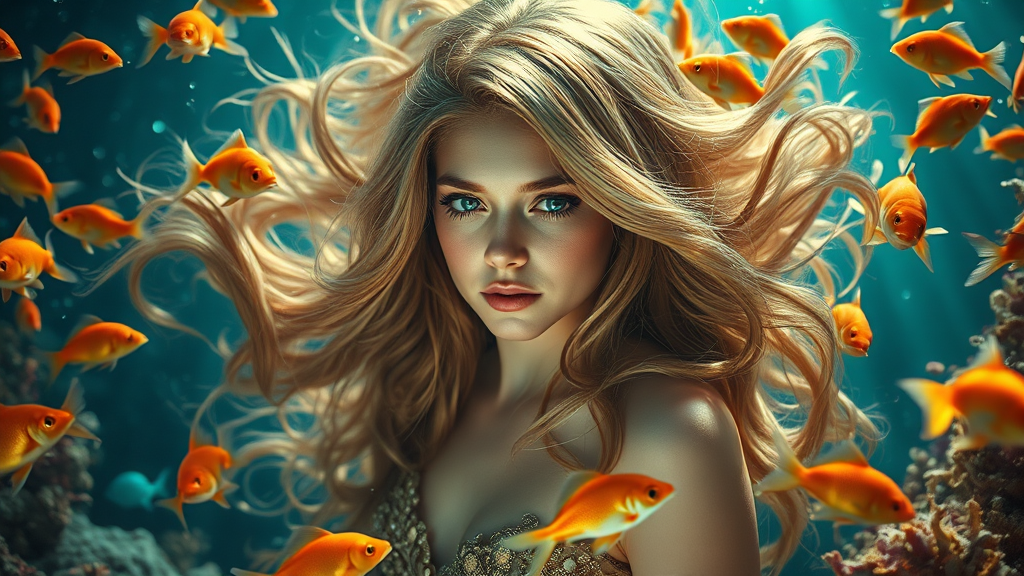 Portrait of an enchanting mermaid with flowing, lustrous long hair surrounded by a swirl of shimmering goldfish amidst a vibrant tapestry of marine life, illuminated by subtle beams of light filtering through the water's depths. Captured with a cinematic 35mm lens at F/2.8, the scene is enhanced with dramatic spotlight and cinematic lighting, showcasing an exquisitely detailed, ornate composition with a graceful, elegant aura, portrayed in 4k resolution and a 1:2 aspect ratio, creating a richly textured, immersive visual experience punctuated with a delicate vignette.