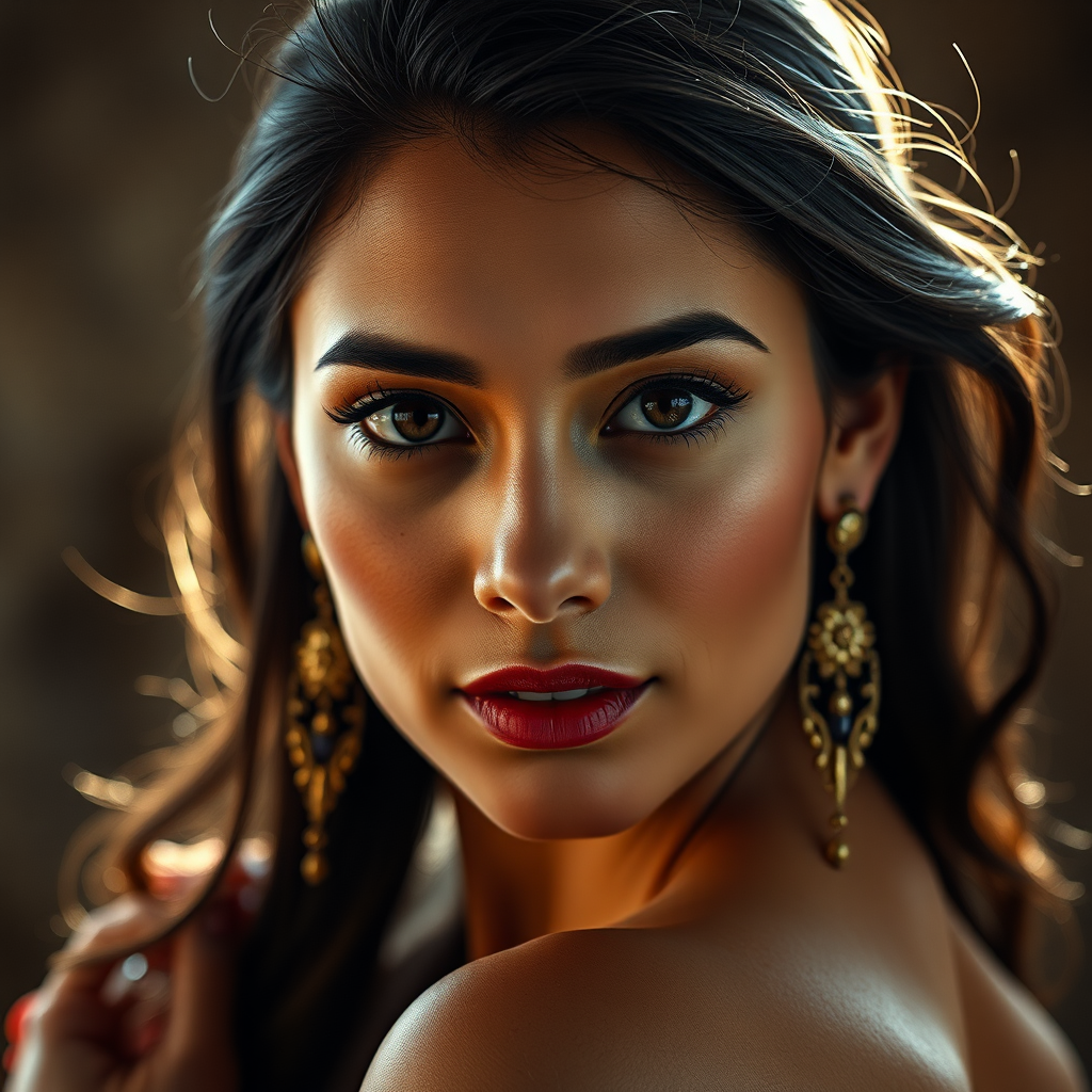 Portrait of an enchanting Mexican woman with captivating elegance, showcasing intricate detail and a 30-megapixel resolution, captured in breathtaking 4k with an 85-mm lens. The photograph exhibits sharp focus with an aperture of f/8 and ISO 100, paired with a shutter speed of 1/125. Soft back lighting adds a luminous quality, resulting in an award-winning image highlighting subtle catchlights in her eyes. With high sharpness and impeccable facial symmetry, the 8k resolution emphasizes her natural beauty. The composition maintains an aspect ratio of 18:32, presenting a timeless and mesmerizing portrait.