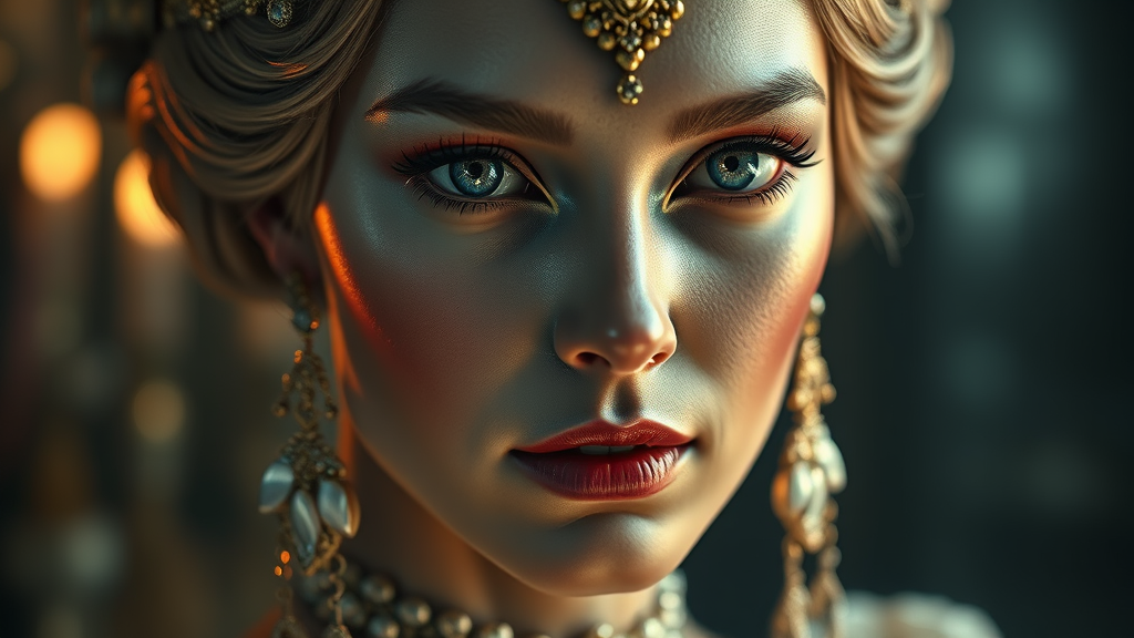 Portrait of an enchanting royal figure, exquisitely detailed, dramatic cinematic lighting, intricately crafted facial features, mesmerizing reflections, advanced ray tracing, rendered with octane precision, crisp focus, silky smooth finish, 8k resolution, masterful digital painting, gaining traction on art platforms, in the artistic styles of Seb McKinnon and Greg Rutkowski, enhanced with a touch of ethereal mystique and timeless elegance.