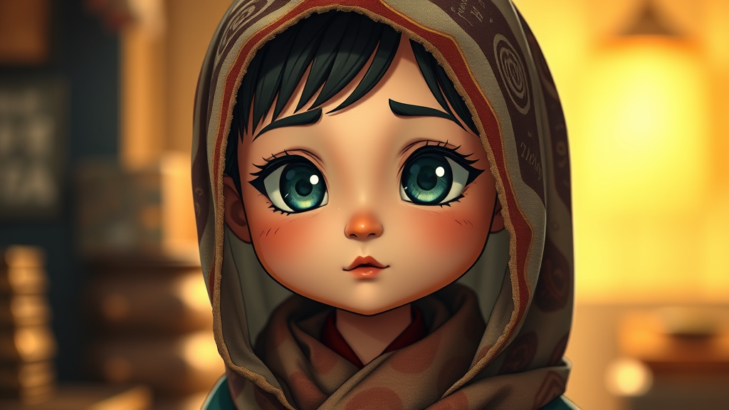 Portrait of an endearing character, adorned in a head scarf, chibi style, featuring cinematic and ambient lighting with intricate details and ornate elements, captured in 8k UHD and HDR. The image includes subtle text and writing elements, with slight duplicates and minor mutations like a whimsical long neck and playful extra fingers. The character's features are slightly exaggerated, creating a charming, cross-eyed expression. The overall composition is intentionally imperfect with some low-resolution aspects, including out-of-frame elements, a slightly blurry appearance, and hints of jpeg artifacts, ensuring a uniquely stylized portrayal with charming imperfections.