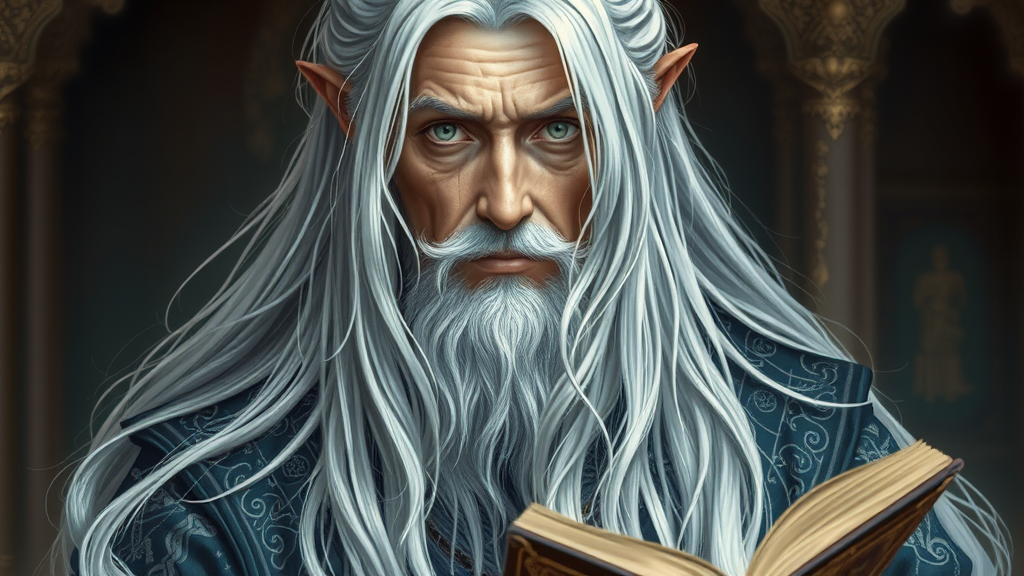 Portrait of an enigmatic sorcerer, cascading long white hair with streaks of grey and silver, exuding maturity and serenity. His eyes, captivating and wise, reflect kindness and an air of mystique. Dressed in ornately designed traditional garb, he holds an ancient tome, suggesting a life steeped in magic and lore. The scene is a fantasy tableau, rich with intricate, elegant details, capturing the essence of a multidimensional spirit. A digital masterpiece, this artwork is a seamless blend of smooth and sharp focus, embodying both concept art and illustration qualities.