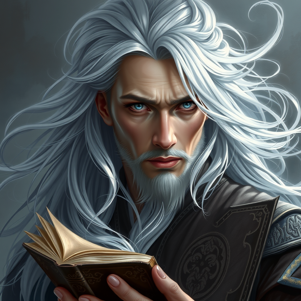 Portrait of an enigmatic sorcerer with flowing white hair and silver-grey hues, exhibiting wisdom and tranquility. His eyes, intricate and kind, reveal a touch of magic. Clad in traditional attire, he holds an ancient book of spells, embodying a fantastical charm. The scene is intricately detailed, showcasing elegance and a multidimensional aura. A digital painting that captures the spirit of mysticism with smooth yet sharply defined features, it stands as a stunning piece of concept art and illustration.