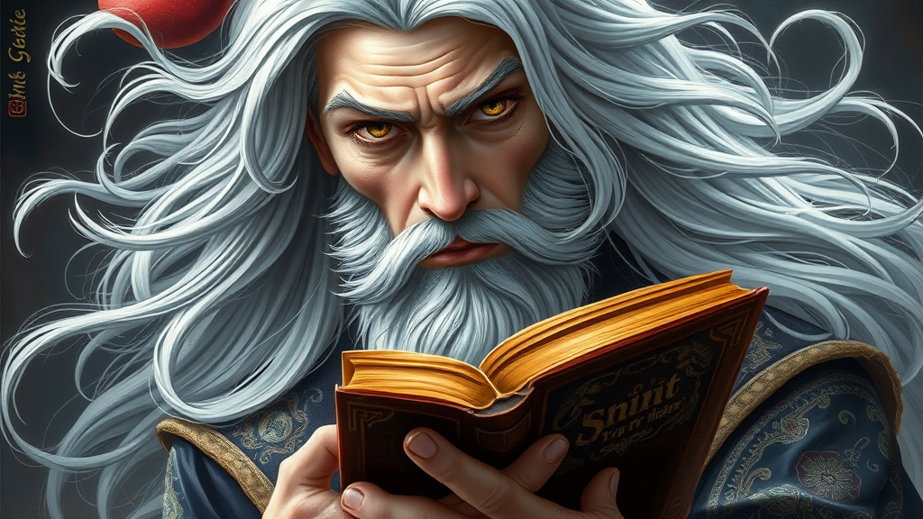 Portrait of an enigmatic wizard with flowing silver and white hair, a visage marked by wisdom and tranquility. His eyes, deep and detailed, reflect kindness and an aura of magic. Clad in an ornate, traditional costume, he cradles an ancient tome, brimming with fantastical secrets. This digital painting captures an intricate and elegant essence, with multidimensional elements swirling around his figure. It's a smooth and sharply focused illustration that evokes the spirit of fantasy and mystery, enriched with vivid detail and artistic depth.