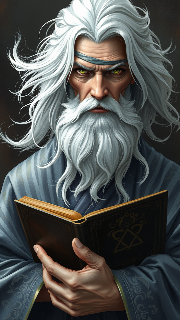 Portrait of an enigmatic wizard with flowing white hair, dressed in shades of grey and silver, exuding maturity and serenity. His eyes are captivating and kind, glowing with mysterious wisdom. Clad in an ornate traditional robe, he holds an ancient tome, suggesting a mastery of magic and knowledge. The scene is fantasy-infused, intricately detailed, and exudes elegance. The digital painting captures a sense of multidimensional spirituality, with smooth, sharp focus, creating a vivid and imaginative illustration.