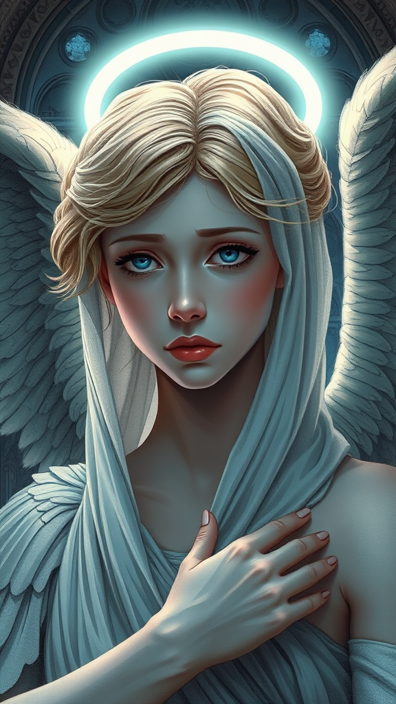 Portrait of an epic, realistic angel with a deeply sad facial expression, surrounded by a halo of light on the head, in the painting style reminiscent of French painter Alexandre Cabanel. The angel has striking blue eyes and wears a delicate veil, set against the backdrop of an ancient cathedral. The soft neon lighting enhances the ethereal quality, blending elements of 3D and sketch aesthetics. While capturing the essence of glorious art, the portrayal subtly nods to cartoon and anime influences. Despite low resolution and normal quality, the depiction intentionally exaggerates anatomy, presenting oversized musculature and an unusual posture. While playful with anatomical quirks like exaggerated hands and subtle facial asymmetries, the angel maintains a mysterious allure within this imaginative and surreal interpretation.