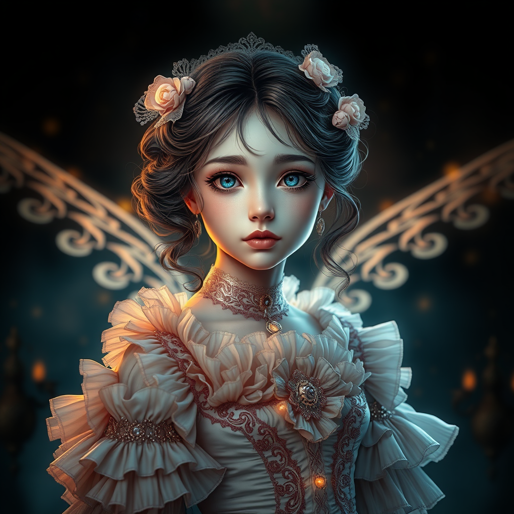 Portrait of an ethereal Lolita girl, dreamy and magical, serene expression, wearing an ornate frilly dress with fantasy elements. The setting is dark and atmospheric with glow effects, showcasing intricate and detailed design. The image is a highly detailed digital painting in a cinematic style, featuring vivid and vibrant colors with a professional finish. The scene is sharp and focused, with a depth of field that emphasizes her elegant appearance. The artwork is hyperrealistic, capturing textured skin and remarkable detailed pupils. The image exudes a sense of majesty, trending on popular art platforms, created with an artistic touch using an 8k UHD resolution. The composition is to reflect a whimsical yet humorous illustration, with a studio feel and no digital imperfections such as blurriness, artifacts, or improper framing.