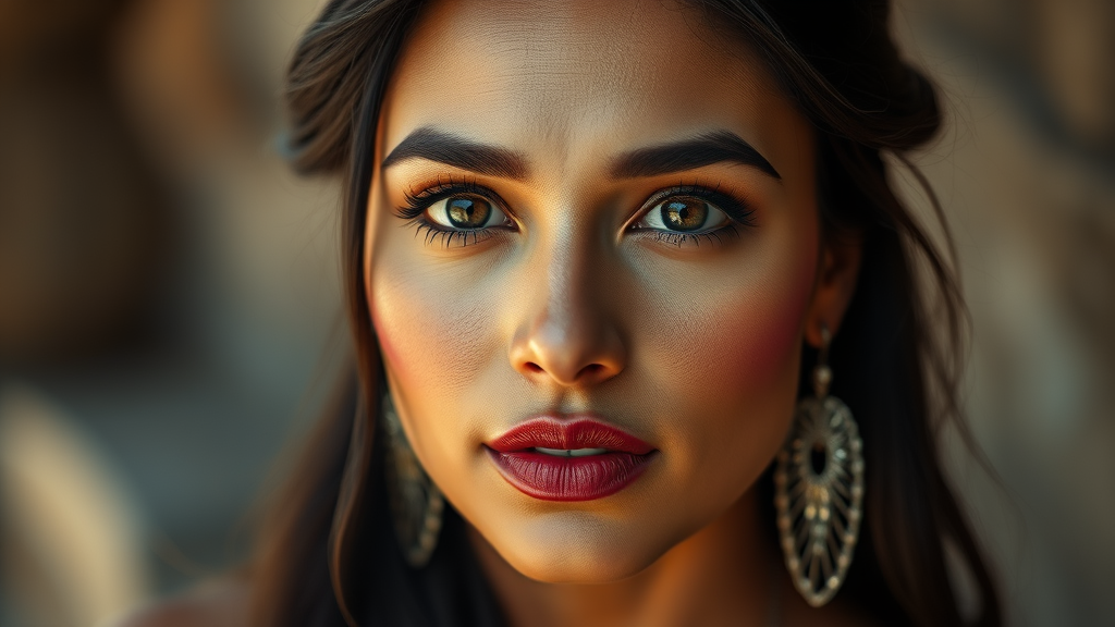 Portrait of an exquisite Mexican woman with stunning detail, 32-megapixel clarity, captured with a 100-mm lens for enhanced depth, sharp focus, aperture f:5.6 for a beautifully blurred background, ISO 200 for crisp brightness, shutter speed 1/250 to freeze the moment, soft backlighting creating a halo effect, an award-winning image showcasing subtle catchlights in the eyes, superior sharpness, perfect facial symmetry, rendered in ultra-high definition 8k resolution, embodying elegance and grace.