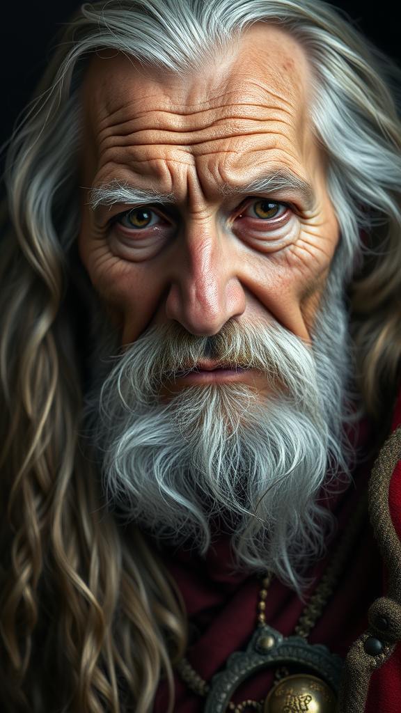 Portrait of an extraordinary elderly superhero, captured in stunning ultra-realistic detail with style influences from Martin Schoeller's photography. The scene reveals an intricately detailed face, with a rugged yet kind expression, and is enhanced by Rembrandt-style lighting. His long hair, adorned with subtle ornaments, flows elegantly, while his skin exhibits a dewy glow, imparting a sense of vitality and wisdom. Drawing inspiration from artists like Artgerm and WLOP, the studio photo radiates a hyperdetailed aesthetic, blending modern and classic photographic elements akin to those produced by Zeiss and Leica lenses.