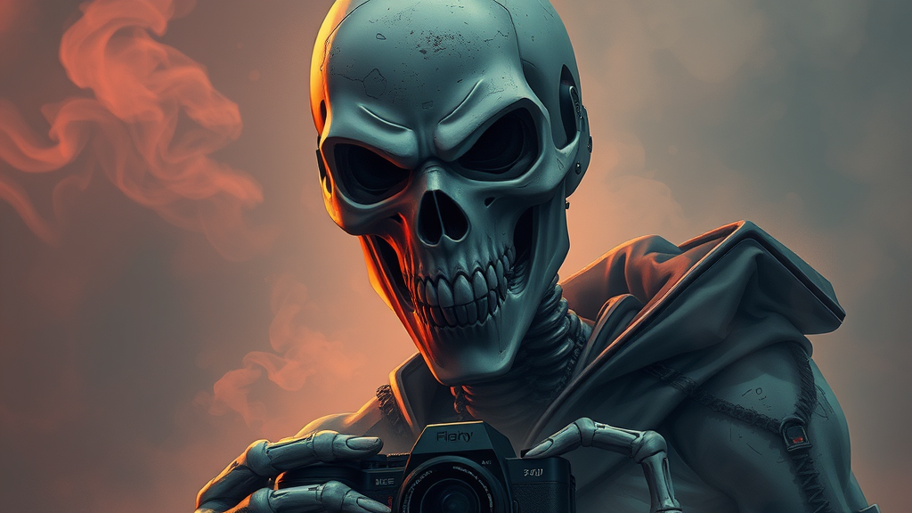Portrait of an intimidating supervillain in a skeleton mask, embodying ruthless techno aesthetics, with a palette of muted and light colors. The scene is shrouded in smoke, drawing inspiration from anime and comic styles, delivering an 8k digital painting that captures an epic and dramatic composition. The artwork is intricate, with a rich attention to detail. Despite being plagued by intentional imperfections such as low-quality textures, jpeg artifacts, and distorted elements, the villain exhibits a myriad of exaggerated features. This includes poorly drawn hands and face, mutative and deformed anatomy, with dehydrated and disproportionate body parts, extra limbs, and an unnaturally long neck. A sense of chaos is amplified by disfigured facial features and malformed limbs. The image incorporates elements such as a camera, and is marked with text, names, and possible signatures that hint at ownership but remain partially cut off or censored, culminating in a portrayal of a villain defined by both menace and surreal imperfection.
