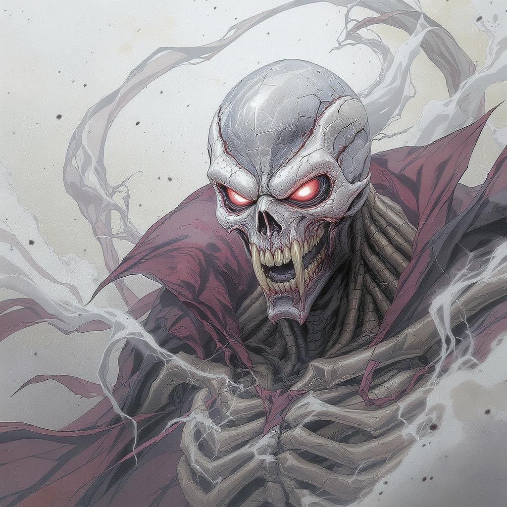 Portrait of an intimidating supervillain wearing a skeletal mask, depicted with a fierce and brutal demeanor. Set in a techno-inspired world, the artwork features light, muted colors with swirling smoke effects. Captured in an anime style blended with comic elements, it showcases an 8k resolution digital painting with an intricate and detailed composition. The scene is dramatic, with an epic visual layout. However, it incorporates elements of imperfection, such as JPEG artifacts, and exhibits a sense of morbidity with grotesque proportions, disfigured and malformed anatomy, and signs of mutilation. The character possesses extra limbs and displays merged or deformed facial features. These features reflect a nightmarish and chaotic figure with exaggerated, elongated characteristics like a stretched neck. Designed to evoke a sense of discomfort, this creative piece includes elements like misaligned and poorly rendered parts. The artwork avoids distinct branding marks or text, allowing the unsettling visual narrative to take center stage.
