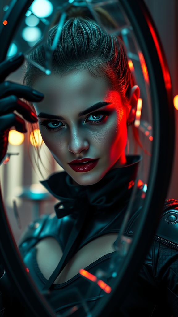 Portrait of an intriguing and striking young woman embodying the essence of the Joker, styled in a unique fusion of Christopher Nolan's dark narrative with a sleek, feminine twist. She dons a stylized female Batman costume that accentuates both her allure and menacing presence, while a sinister grin plays across her lips. Her gaze pierces through a fractured mirror, reflecting a world steeped in horror and suspense. The setting is infused with a chilling atmosphere, capturing her elegance and form. This high-detail, professional photograph is rendered in vivid realism, merging elements of cyberpunk aesthetics and contemporary fashion. The composition is further enhanced by a pearl-like sheen, with animated lighting that dances across the scene, highlighting the complexity and depth of textures. Utilizing advanced 3D techniques such as octane rendering and ray tracing, the image captures every intricate detail, presenting a compelling visual narrative suitable for a high-definition wallpaper, blending the boundary between fantasy and reality.
