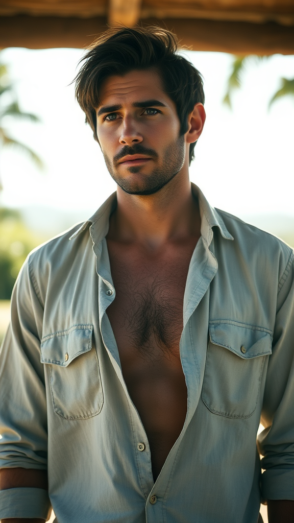 Portrait of an unshaven Pedro Pascal from The Last of Us, wearing a partially unbuttoned light linen summer shirt, standing in natural outdoor lighting. The shot captures a contemplative expression using a Hasselblad H4D-200MS Digital Camera with a Mitakon Speedmaster 85mm f/1.4 XCD lens, maintaining a high level of detail and capturing the softness of the background. The atmosphere exudes a relaxed, sunlit ambiance that complements the character's rugged charm.