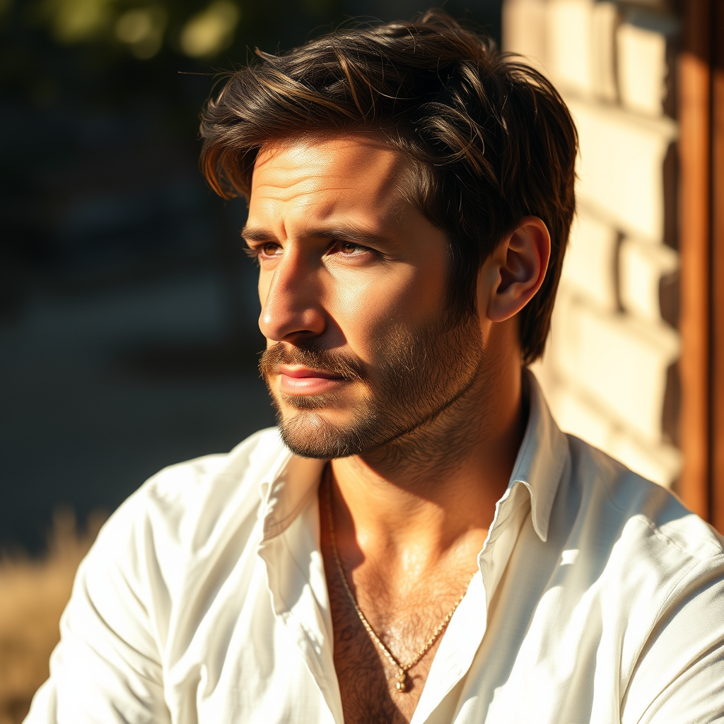 Portrait of an unshaven Pedro Pascal, inspired by The Last of Us, wearing a slightly unbuttoned white linen summer shirt, basking in the warm glow of natural outdoor light. The image captures a rugged yet introspective expression, shot with a Hasselblad H4D 200MS Digital Camera, utilizing a Mitakon Speedmaster 85mm f/1.4 lens. The composition highlights the play of light and shadow across his face, emphasizing the depth of character and emotion. The aspect ratio is akin to a cinematic portrait, drawing attention to his thoughtful gaze and relaxed posture, set against a softly blurred, sunlit background.