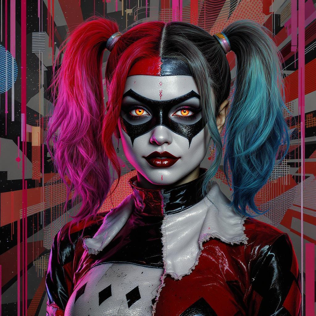 Portrait of Ana de Armas as Harley Quinn, featuring intricate abstract elements and a blend of styles inspired by Tooth Wu, wlop, Beeple, and Dan Mumford. Rendered in high detail with an emphasis on hyper-realism, the artwork is coherent and symmetrical, capturing a cinematic essence. The 8k octane render showcases vibrant colors and dynamic lighting, trending on ArtStation in the style of Greg Rutkowski. The scene incorporates inventive details that subtly modify the core concept, adding a unique, captivating twist.