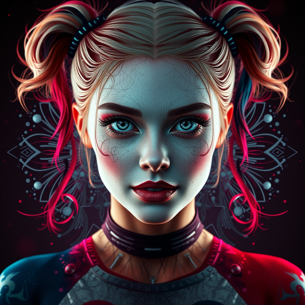 Portrait of Ana de Armas as Harley Quinn, reimagined with an intricate abstract style, blending the artistic influences of Tooth Wu, WLOP, Beeple, and Dan Mumford. Crafted with octane render for a trending ArtStation piece, the work showcases a very coherent and symmetrical composition by Greg Rutkowski. Featuring cinematic hyper-realism with exceptional high detail, the image presents an 8K quality render. Creative elements introduce a touch of ethereal elegance, as delicate patterns intertwine with vibrant colors, while maintaining the core essence of the iconic character.