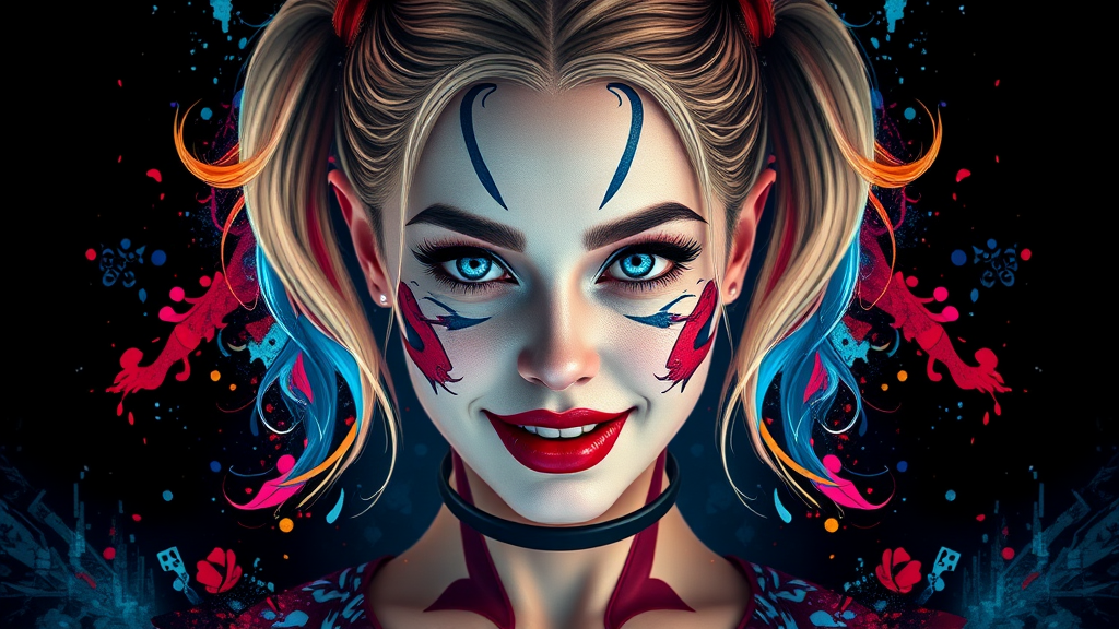 Portrait of Ana de Armas reimagined as Harley Quinn, featuring an intricate abstract design with elements of chaos and beauty. The artwork captures a fusion of vibrant colors and dynamic energy, influenced by the styles of Tooth Wu, WLOP, Beeple, and Dan Mumford, creating a mesmerizing blend of styles. Rendered with cinematic hyper-realism and high detail using Octane Render, the piece presents a very coherent and symmetrical composition. Trending on ArtStation, the artwork channels the intricate interplay of light and texture, marked by Greg Rutkowski's signature touch, striving for an 8k resolution masterpiece that feels vividly alive and compelling in its execution.