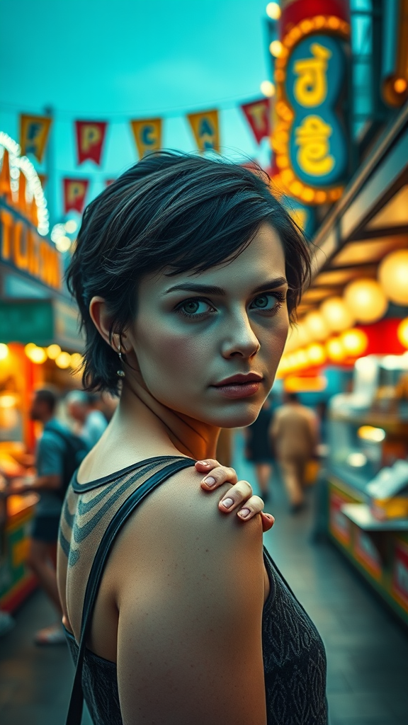 "Portrait of Daisy Ridley at an amusement park, gazing at the camera with short dark hair, surrounded by bustling merchant stalls offering colorful food and souvenirs. Bright banners adorn the walkways, creating a lively atmosphere. The scene is captured in sharp focus with professional portrait photography, emphasizing dramatic lighting. The composition is inspired by artists wlop, Jeffrey Simpson, Antonio J. Manzanedo, and Greg Rutkowski. The image has a painterly quality with attention to depth of field, reminiscent of an illustration or drawing. Daisy presents a contemplative expression amidst the vibrant setting, with unique creative elements like additional fingers subtly integrated. The mood is contrasted with monochrome touches, incorporating artistic errors like slight blurring for an intriguing effect. The overall result is a stylized, shaded masterpiece that melds realism with artistic whimsy, featuring unexpected elements like displaced feet and out-of-frame hints."