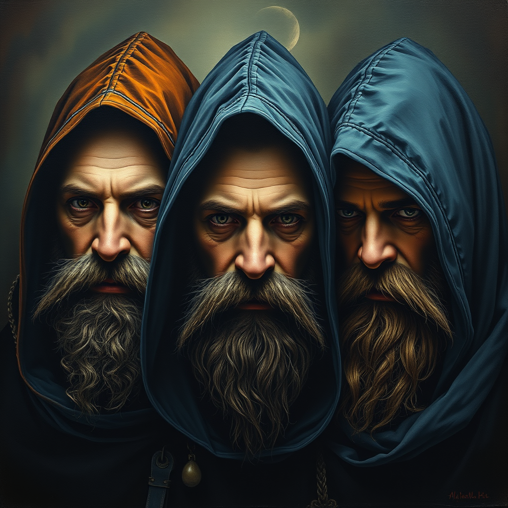 Portrait of enigmatic hooded men with beards, depicted in the style of an oil painting. The composition showcases intricate complexity, adhering to the rule of thirds. The mood conveys a hint of madness, focusing on character concept with dramatic lighting. The artwork features a play of complementary colors, enhancing the mysterious atmosphere.