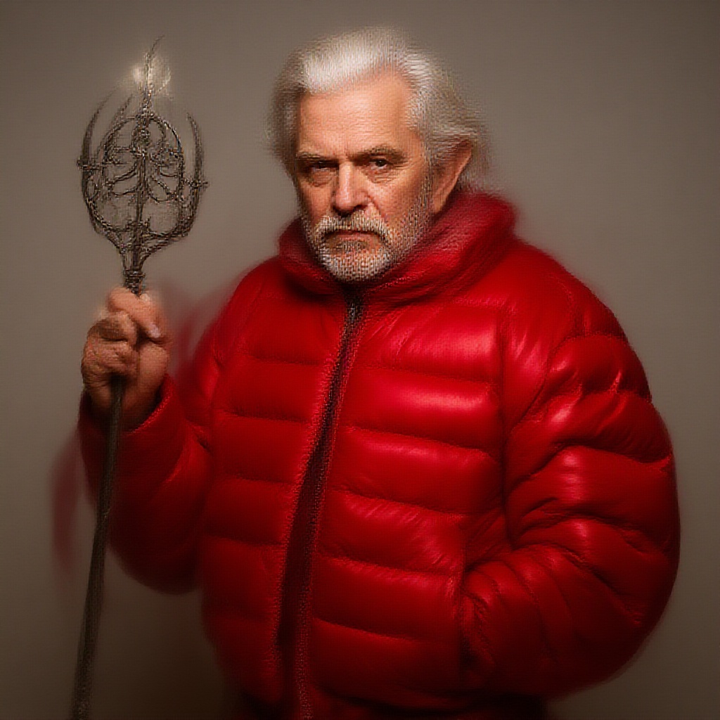 Portrait of Gandalf holding a scepter, wearing a metallic red inflatable oversized jacket designed by Yeezy and Balenciaga. The scene is a well-lit fashion shoot, emphasizing sharp focus and intricate cinematic details. The atmosphere is glamorous and symmetrical, with soft, indirect lighting as if for a Vogue editorial. Gandalf's presence is both majestic and contemporary, blending his timeless wisdom with high fashion. His expression is serene yet commanding, a fusion of mythical and modern-day style. The jacket's metallic sheen catches the light, complementing the intricate textures. The overall composition is striking and artistic, celebrating an iconic character in a fashion-forward setting.