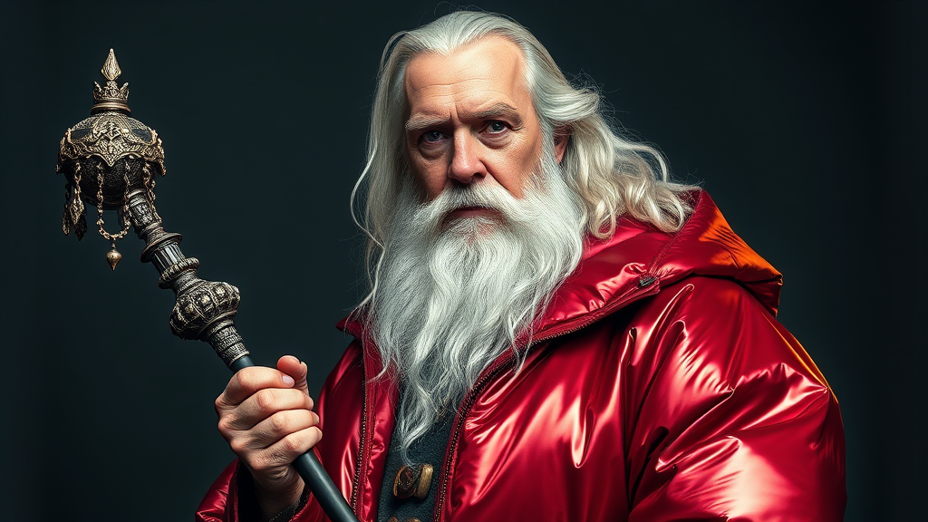 Portrait of Gandalf in a well-lit fashion shoot, holding a detailed scepter, wearing a metallic crimson inflatable oversized jacket by Yeezy and Balenciaga. The image is sharp and cinematic with soft, indirect lighting, evoking a glamorous and symmetrical Vogue editorial style. It captures the essence of high fashion with intricate details and a sense of grandeur. Gandalf is depicted with a dignified expression, with his iconic beard and wise eyes adding to the character. The focus on craftsmanship and the interplay of light highlights the textures of the jacket, creating a captivating and stylish portrait.
