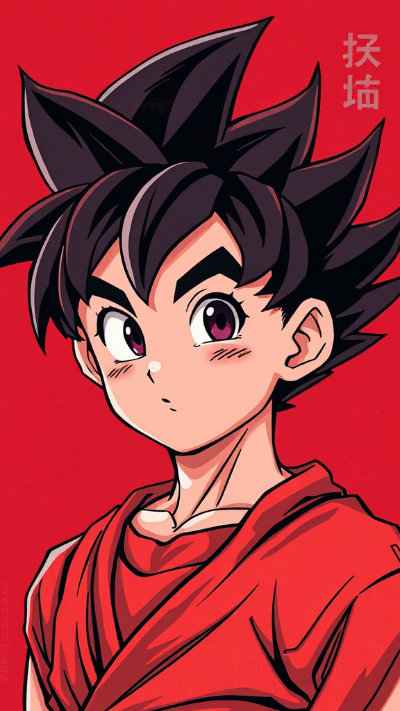 Portrait of Goku in a fusion of street art aesthetic and anime, featuring cute cartoonish designs blended with photo-realistic techniques. The color palette is dominated by dark red, evoking a sense of childhood nostalgia. The artwork captures the essence of childhood arcadias through cartoon-like figures, with a unique blend of anime aesthetics.