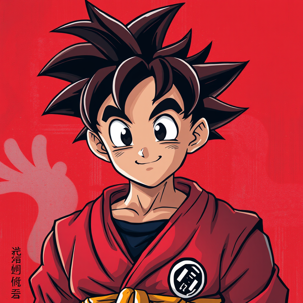 Portrait of Goku in a street art aesthetic blending cute cartoonish designs with photo-realistic techniques, featuring a dark red color palette that evokes childhood arcadias and anime aesthetics, capturing a whimsical yet intense aura with cartoon-like figures and a vivid, nostalgic atmosphere.
